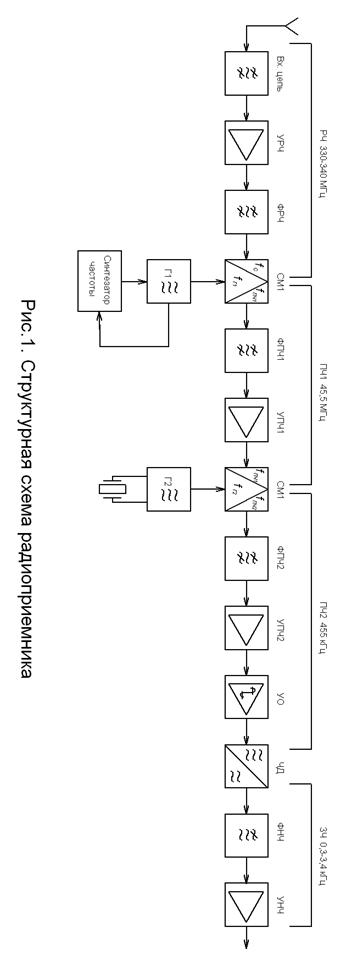 Полученное значение максимального коэффициента шума следует учесть при выборе микросхем тракта радиочастоты и активных радиоэлементов. 2. Выбор и обоснование структурной схемы Как уже было установлено ранее, проектируемый приемник должен иметь два преобразования частоты, поэтому его структурная схема будет строиться согласно типовой схеме супергетеродинного радиоприемника с двумя преобразованиями. Коэффициент