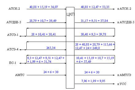 Курсовая работа: Современные электронные системы автоматической коммутацииРаспределение нагрузки к встречным АТС, если не известны значения коэффициентов тяготения, производится пропорционально нагрузкам данных станций: Yij = Yi,и · ( Yj,и / Интенсивность исходящей нагрузки от АТСЭ-1: Y1-2 = Y1,и · Y2и / (Y2и + Y3и + Y4и + Yпс,и) = 87,77 · 117,71 / 368,91 = 28 Эрл. Y1-3 = Y1и · Y3и / (Y2и + Y3и + Y4и + Yпс,и) = 87,77 · 89,75 / 368,91 = 21,35 Эрл. Y1-4 = Y1и · Y4и / (Y2и + Y3и + Y4и + Yпс,и) = 87,77 · 117,71 / 368,91 = 28 Эрл. Y1-пс = Y1,и · Yпс,и / (Y2и + Y3и + Y4и + Yпс,и) = 87,77 · 43,74 / 368,91 = 10,41 Эрл. Интенсивность исходящей нагрузки от АТСК-2: Y2-1 = Y2,и · Y1и / (Y1и + Y3и + Y4и + Yпс,и) = 117,71 · 87,77 / 338,97 = 30,48 Эрл. Y2-3 = Y2и · Y3и / (Y1и + Y3и + Y4и + Yпс,и) = 117,71 · 89,75 / 338,97 = 31,17 Эрл. Y2-4 = Y2и · Y4и / (Y1и + Y3и + Y4и + Yпс,и) = 117,71 · 117,71 / 338,97 = 40,88 Эрл. Y2-пс = Y2,и · Yпс,и / (Y1и + Y3и + Y4и + Yпс,и) = 117,71 · 43,74 / 338,97 = 15,19 Эрл. Интенсивность исходящей нагрузки от АТСДШ-3: Y3-1 = Y3и · Y1и / (Y1и + Y2и + Y4и + Yпс,и) = 89,75 · 87,77 / 366,93 = 21,47 Эрл. Y3-2 = Y3и · Y2и / (Y1и + Y2и + Y4и + Yпс,и) = 89,75 · 117,71 / 366,93 = 28,79 Эрл. Y3-4 = Y3и · Y4и / (Y1и + Y2и + Y4и + Yпс,и) = 89,75 · 117,71 / 366,93 = 28,79 Эрл. Y3-пс = Y3и · Yпс,и / (Y1и + Y2и + Y4и + Yпс,и) = 89,75 · 43,74 / 366,93 = 10,7 Эрл. Интенсивность исходящей нагрузки от проектируемой АТСЭ-4: Y4-1 = Y4и · Y1и / (Y1и + Y2и + Y3и + Yпс,и) = 117,71 · 87,77 / 338,97 = 30,48 Эрл. Y4-2 = Y4и · Y2и / (Y1и + Y2и + Y3и + Yпс,и) = 117,71 · 117,71 / 338,97 = 40,88 Эрл. Y4-3 = Y4и · Y3и / (Y1и + Y2и + Y3и + Yпс,и) = 117,71 · 89,75 / 338,97 = 31,17 Эрл. Y4-пс = Y4и · Yпс,и / (Y1и + Y2и + Y3и + Yпс,и) = 117,71 · 43,74 / 338,97 = 15,19 Эрл. Интенсивность исходящей нагрузки от проектируемой ПС-1: Yпс-1 = Yпс,и · Y1и / (Y1и +Y2и +Y3и + Y4и) = 43,74 · 87,77 / 412,94 = 9,3 Эрл. Yпс-2 = Yпс,и · Y2и / (Y1и +Y2и +Y3и + Y4и) = 43,74 · 117,71 / 412,94 = 12,47 Эрл. Yпс-3 = Yпс,и · Y3и / (Y1и + Y2и + Y3и + Y4и) = 43,74 · 89,75 / 412,94 = 9,51 Эрл. Yпс-4 = Yпс,и · Y4и / (Y1и + Y2и + Y3и + Y4и) = 43,74 ·117,71 / 412,94 = 12,47 Эрл. 5. МАТРИЦА И СХЕМА РАСПРЕДЕЛЕНИЯ ИНТЕНСИВНОСТИ НАГРУЗКИ Результаты расчетов сведены в матрицу нагрузок (табл. 4). Эрл. Таблица 4.