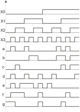 Функциональная схема содержит сведения о способах реализации устройством заданных функций. По такой схеме можно определить, как осуществляются преобразования и какие для этого необходимы функциональные элементы. Каждый функциональный элемент содержит лишь те входы и выходы, которые необходимы для его корректной работы. Данная схема разрабатывается на основе структурной схемы для каждого блока, в результате из отдельных функциональных элементов составляется общая функциональная схема объекта. Полная функциональная схема генератора представлена в приложении 1. 2.1. Блок преобразования двоичного кода в семисегментный. Данный блок разрабатывается методом синтеза логических устройств с несколькими выходами, то есть на входе логического устройства есть 4-х значная двоичная комбинация, а на выходе 7-ми значная комбинация (семисегментный код). Для визуализации чисел требуются индикаторы, отображающие цифры в привычной для человека форме, чаще всего это цифры десятичной и шестнадцатеричной систем счисления. Простейшим из светодиодных индикаторов, выполняющих функции отображения выше названных чисел и некоторых других символов является семисегментный индикатор. Имеется семь элементов, расположенных так, как показано на рис. 2.1.1.