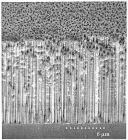 Рисунок 1 – Перпендикулярный поверхности рост пор на пластине ориентации (111) В зависимости от многих факторов (плотность тока, протекающего через образец, кристаллографическая ориентация пластины, тип проводимости, уровень легирования, состав и температура травителя, наличие или отсутствие подсветки, состояние поверхности), пористые слои могут весьма сильно различаться по своим структурным свойствам[14, 15]. В том случае, когда диаметр пор больше 50 нм, говорят о наличии макропористой структуры; при диаметре пор от 50 нм до 5 нм говорят о мезапористом слое, и в случае диаметра пор меньше 5 нм говорят о микропористой структуре слоя. Для образцов p-типа, как показывают авторы работы [15], формирование на