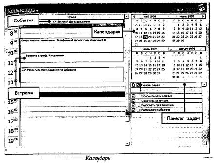 Входящие - поддерживает несколько систем электронной почты (в том числе Internet Mail, Microsoft Май, Exchange Server и Microsoft Network), дает возможность посылать и получать сообщения, приглашения на собрания и получать запросы на выполнения задач. Календарь - контролирует расписание и планирует встречи с другими людьми. Можно просмотреть отчеты, обзоры за день, неделю, месяц. Кроме того, новая функция (Автодата) позволяет вводить дату на разговорном языке (например, в следующую среду) и получать ее преобразование - 7 июля 1999 г. Outlook может напомнить о предстоящей встрече звуковым сигналом. При организации собрания, совещания "Планировщик собрания" выберет наиболее удобное для всех время и известит в нужный момент об этом мероприятии. Контакты - хранит и постоянно обновляет сведения о деловых контактах. Эта папка является мощной базой данных контактов. Эти сведения можно находить и сортировать любым способом. Можно сразу перейти на страницу Web любого партнера, можно связаться с адресатом по модему, послать электронную почту. Задачи - содержит список дел, которые необходимо выполнить. Их можно расставлять по приоритетам и поручать другим исполнителям. Здесь можно не только сформулировать задание, но и послать указание по электронной почте исполнителю. При приеме такого поручения папка "Задачи" каждого исполнителя обновляется автоматически. Дневник - ведет учет важных событий, действий и контролирует их выполнение. Колонка времени показывает, когда выполнялось конкретное действие. Можно задать, чтобы Дневник показывал, когда проводилась работа с документами и как долго. Эта функция незаменима для контроля исполнения документов. Заметки - электронный заменитель блокнота с отрывными листками, куда заносятся оперативные вопросы, ценные мысли, напоминания, указания и многое другое