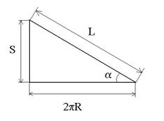 Рисунок 3.3 – Развертка спирали где l= c/f, где c - скорость света, f - рабочая частота, n - число витков спирали, a - угол подъёма витка, R - радиус спирали, S - шаг витка спирали, L - длина витка спирали, l – длина всей спирали. Таким образом, расчётные соотношения для цилиндрической спирали: