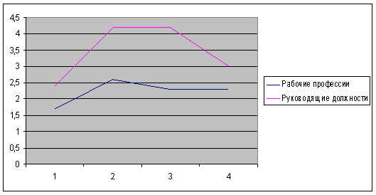 Рисунок 3.4 Где: 1 – напряженность взаимодействия со средой (ниже среднего для всего коллектива); 2 – легкость переключения с одних программ на другие (средняя для рабочих профессий, высокая – для руководителей); 3 – быстрота исполнения программ поведения (ниже среднего для рабочих профессий, высокая – для руководителей); 4 – чувствительность к возможному несовпадению результата действий с предполагаемой оценкой (средняя для руководителей, ниже среднего – для рабочих). Показатели также незначительно (больше у рабочих профессий) выросли. Средняя оценка сотрудников (методом Дельфи) по личностным, деловым характеристикам и навыкам делового общения приведена в таблице 3.3. (оценка по десятибалльной шкале). Таблица 3.3