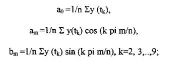 решив которое, мы будем знать среднюю по перечню цену экспортно импортного товара В нашем случае функция у ( t) определена на интервале Т длиной 8 лет. Разделим его на 2п разных частей, назначив для наглядности, а в коммерческом проекте для реальности, величину элементарного шага равной одному году, предопределив тем самым п=4. Тогда мы можем определить коэффициенты ряда Фурье.
