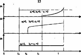 фонд может обеспечить разный прирост прибыли Предположим, что всего возможны 3 варианта вложений: a. на совершенствование производственной базы предприятия; b. на обновление создаваемой продукции; c. на повышение квалификации специалистов. Примем, что эффективность вложений | где аi >0, bi >0, a ci может быть как положительной, так и отрицательной величиной. Продолжительность t выбирается по каким-либо непротиворечивым соображениям, с соблюдением условия t > тmах. В зависимости от изменения величин коэффициентов при X в уравнении (1), функция эффективности капитальных вложений может иметь следующий вид (см рис 4).