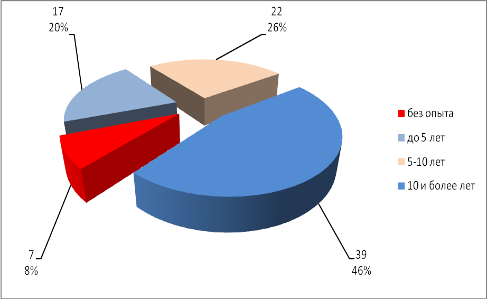 Рис. 8. Характеристика персонала ОАО «РАТА» по опыту работы На рисунке 8 видно, что большинство сотрудников (46%) имеют опыт работы более 10 лет, 26% сотрудников имеют опыт работы от 5 до 10 лет, 20% сотрудников – менее 5 лет. И только 8% не имеют опыта вообще. Это говорит о высокой квалификации персонала на предприятии, и в то же время наглядно подтверждает отсутствие обновления кадрового состава. Существует взаимосвязь образования и текучести рабочих кадров. Наблюдается тенденция сокращения размеров текучести с повышением образовательного ценза. По мере роста уровня общего образования изменяются мотивы текучести рабочих кадров. Для характеристики движения рабочей силы рассчитаем и анализируем динамику следующих показателей [13, 297]: -