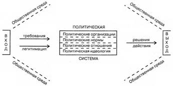 Рис. 1. Политическая организация общества по В.В. Лазареву В науке имеется множество различных понятий политической системы, что объясняется тем, что отдельные исследователи избирают разные критерии для характеристики политической системы или преследуют разные исследовательские цели. Тем не менее можно выделить следующие основные признаки политической системы: · во-первых, тесная связь ее с государственной властью, с борьбой за государственную власть и ее осуществление; · во-вторых, выражение политических интересов различных классов, социальных слоев и групп; · в-третьих, наличие организационных форм выражения политических интересов; · в-четвертых, урегулированность отношений между институтами политической системы правовыми, политическими нормами и политическими традициями. [5] С учетом названных признаков политическую систему определяют как совокупность государственных и негосударственных политических институтов, выражающих политические интересы различных социальных групп и обеспечивающих их участие в принятии политических решений государством.[6] В науке также известны несколько основных теорий политической системы. Теория Т. Парсонса заключается в том, что общество взаимодействует как четыре подсистемы: экономическая, политическая, социальная и духовная. Всякая из этих подсистем выполняет определенные функции, реагирует на требования, которые поступают изнутри или извне. Вместе они обеспечивают жизнедеятельность общества в целом. - экономическая подсистема отвечает за реализацию потребностей людей в потребительских товарах. -политической подсистемы определяет коллективные интересы, мобилизует ресурсы на их достижение. -социальная подсистема обеспечивает поддержание устоявшегося образа жизни, передача новым членам общества норм, правил и ценностей, которые становятся важными факторами мотивации их поведения. -духовная подсистема осуществляет интеграцию общества, устанавливает и сохраняет связи солидарности между ее элементами. Теория Д. Истона считается наиболее детально разработанной и рассматривает политическую систему как механизм формирования и функционирования власти в обществе по поводу распределения ресурсов и ценностей. Системный подход позволил Д.Истону более четко определить место политики в жизни общества и выявить механизм социальных изменений в нем. Политическая система, взаимодействуя с внешней средой, вырабатывает ответные реакции на поступавшие импульсы.[7] В этом отношении он достаточно четко определил границы политической системы, использовав, понятия "вход" и "выход".[8] На "входе" он выделил два основных элемента: требования и поддержку. Требования – это любое обращение к властным структурам по поводу распределения ценностей в обществе. Д. Истон выделил три основных вида требований: распределительные, регулировочные, коммуникативные. Поддержка им рассматривалась как лояльное отношение со стороны общества к политической системе. Поддержка обеспечивает стабильность функционирования политической системы. Политическая система, реагируя на воздействия внешней среды, преобразует требования и поддержку на “выходе” в решения и действия. Политические решения имеют форму новых законов, заявлений, регламентов. Политические действия осуществляются в виде различных мер