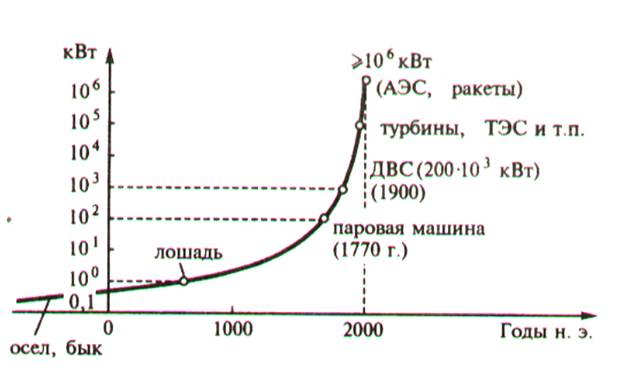 Энергетические уровни техногенных воздействий существенно возросли в XX столетии, когда человек получил в своё распоряжение мощную технику (см. рисунок), огромные затраты углеводородного сырья, химических и бактериологических веществ. В итоге история человечества породила очередной парадокс – в течение многих столетий люди совершенствовали технику, чтобы обезопасить себя от естественных опасностей, а в результате пришли к наивысшим техногенным опасностям, связанны с производством и использованием техники и технологий. Вторая половина XX века связанна с интенсификацией сельскогохозяйственного производства. В целях повышения плодородия почв и борьбы с вредителями в течение многих лет использовались искусственные удобрения и различные токсиканты. При избыточном применении азотных удобрений почва перенасыщается нитратами, а при внесении фосфорных удобрений – фтором, редкоземельными элементами, стронцием. При использовании нетрадиционных удобрений (отстойного ила и т.п.) почва перенасыщается соединениями тяжелых металлов. Избыточное количество удобрений приводит к перенасыщению продуктов питания токсичными веществами, нарушает способность почв к фильтрации, ведёт к загрязнению водоёмов, особенно в паводковый период. Пестициды, применяемые для защиты растений от вредителей, опасны и для человека. Установлено, что от прямого отравления пестицидами в мире ежегодно погибает около 10 тысяч, гибнут леса, птицы, насекомые. Пестициды попадают а пищевые цепи, питьевую воду. Все без исключения пестициды обнаруживают либо мутагенное, либо иное отрицательное воздействие на человека и живую природу. От стихийных явлений в среднем ежегодно в Мире погибает около 140 тысяч человек. В 1996 году в России материальный ущерб от ураганов, дождей, сильных ветров – 1,6 триллиона рублей. До середины XX века человек не обладал способностью инициировать крупномасштабные аварии и катастрофы и тем самым вызывать необратимые экологические изменения регионального и глобального масштаба, соизмеримые со стихийными бедствиями. Число жертв и материальный ущерб от стихийных явлений нарастают. Проявление сил природы сопровождается разрушением промышленных объектов, гидросооружений, транспортных магистралей, возникновением пожаров, затоплением селительных зон и т.п. Появление ядерных объектов, высокая концентрация, прежде всего химических веществ и рост их производства сделали человека способным оказывать разрушительное воздействие на экосистемы, например трагедии в Чернобыле и в Бхопале. Доказано что существует взаимосвязь с испытанием ядерного оружия (подводные и подземные взрывы) с возникновением землетрясений и изменением климата. Примером может являться землетрясения в Афганистане, мощное цунами в Новой Гвинее, последовавшие за подземными взрывами в Пакистане и Индии. В результате активной техногенной деятельности человека во многих регионах нашей планеты разрушена биосфера и создан новый тип среды обитания – техносфера. Создавая техносферу, человек стремился к повышению комфортности среды обитания, к росту коммуникабельности, к обеспечению защиты от естественных воздействий. Всё это благоприятно сказалось на продолжительности жизни людей, в 19 веке была 35-40, а в конце 20 века 60-63 года. Но появление техносферы привело к тому, ч