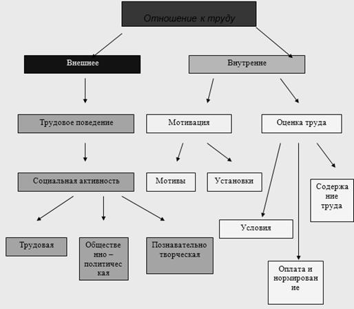 Рис.11 Потребности согласно А. Маслоу Смысл такого иерархического построения заключается в том, что приоритетны для человека потребности более низких уровней и это сказывается на его мотивации. Другими словами, в поведении человека более определяющим является удовлетворение потребностей сначала низких уровней, а затем, по мере удовлетворения этих потребностей, становятся стимулирующим фактором и потребности более высоких уровней. Самая высокая потребность - потребность самовыражения и роста человека как личности - никогда не может быть удовлетворена полностью, поэтому процесс мотивации человека через потребности бесконечен. Долг руководителя заключается в том, чтобы тщательно наблюдать за своими подчиненными, своевременно выяснять, какие активные потребности движут каждым из них, и принимать решения по их реализации с целью повышения эффективности работы сотрудников. 1.4.1 Вознаграждение работников за труд Переход к рыночным отношениям в нашей стране принципиально изменил экономическую природу трудового вознаграждения. Следует заметить, что само это понятие практически не использовалось в период централизованного управления народным хозяйством. Чаще всего вместо него применялся термин "заработная плата" (вариант — "заработная плата и премии"), иногда его — прежде всего, в непроизводственной сфере и для руководства предприятий — заменял термин "жалованье". Трудовое вознаграждение представляет собой более общее понятие, чем все перечисленные выше. Поэтому оно определяется максимально широко: под трудовым вознаграждением понимается совокупность материальных и иных благ, получаемых работником вследствие его участия в процессе труда. Более общим понятием по отношению к нему выступает общеэкономическая категория "полезность". Заработная плата представляет собой основную часть трудового вознаграждения, имеющую материальную форму (денежную либо натуральную) и обладающую большим (основная заработная плата) или меньшим (дополнительная заработная плата) постоянством. Иногда в аналогичном смысле используется также понятие "оплата труда". Трудовое вознаграждение (и, прежде всего заработная плата) всегда было и остается для большинства, членов общества основой их благополучия. Именно за счет его в странах с рыночной экономикой трудящийся и члены его семьи удовлетворяют основную часть своих потребностей в питании, одежде, жилье и т. д. В рыночной экономике заработная плата выполняет три основные функции: 1. Воспроизводственная. Заработная плата (с учетом других доходов) призвана обеспечивать расширенное или простое воспроизводство рабочей силы; 2. Стимулирующая. Заработная плата должна стимулировать повышение уровня профессионализма работников, необходимое для развития предприятия и его внешних связей; 3. Регулирующая. Заработная плата выступает регулятором спроса на продукцию и услуги конечного потребления, а также на труд; Различные составные части заработной платы выполняют различные функции. Это наиболее явственно проявляется при рассмотрении основной и дополнительной заработной платы. Отношения человека к труду в большей степени зависит от размера оплаты труда, но это не является единственным фактором, который на него влияет. Влияние факторов на отношение к труду представлено на рисунке 8.