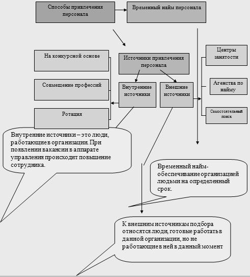 Дипломная работа: Разработка мероприятий по совершенствованию организации и оплаты управленческого трудаВажный момент в оценке персонала - это разработка организационного планов укомплектования, включающих: · разработку программы мероприятия по привлечению персонала; · разработку методов оценки персонала; · расчет затрат на привлечение и оценку персонала; · разработку программ развития персонала. Расчет потребности в персонале. Долговременная потребность в специалистах. Этот расчет осуществляется при глубине планирования на период более трех лет. При определении потребности в специалистах на перспективу и отсутствии детальных планов развития отрасли и производства применяют метод расчета исходя из коэффициента насыщенности специалистами. Который исчисляется как отношение числа специалистов к объему производства. С учетом этого показателя потребность в специалистах будет выглядеть следующим образом: А=Ч р * Кн, где Чр- среднесписочная численность работающих; Кн- нормативный коэффициент насыщенности специалистами. 1.3.3 Способы привлечения персонала Способы привлечения персонала различны, подробно способы привлечения указаны на рисунке 9.